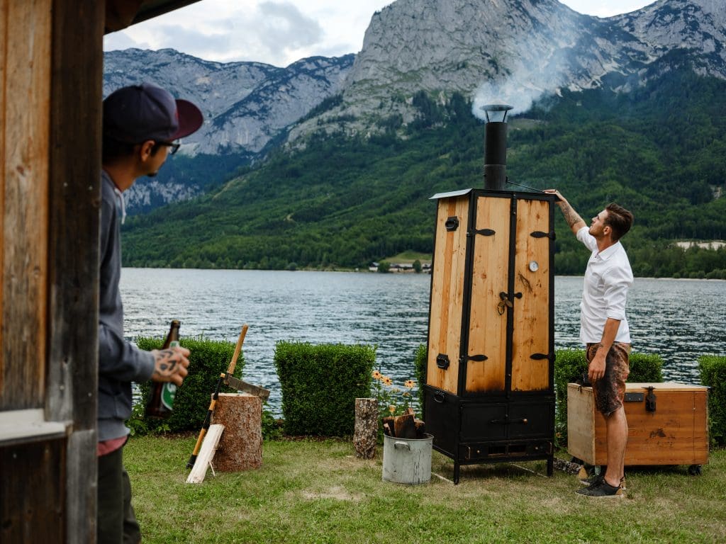 Bleiben wir aber am Grundlsee. Wer bis an sein Ende fährt und vom beschaulichen Gößl zum Toplitzsee spaziert, kommt in der Fischerhütte in den Genuss frisch geräucherter Saiblinge und Forellen. Das Räuchern von Fischen ist kulinarisches Brauchtum im inneren Salzkammergut. Am Grundlsee trifft man auch Max Brandauer, Sohn des Senfmachers am Hallstätter See, der seine Manufaktur nach seinen Kindern Anna und Max benannt hat. Max nennt einen wunderschönen Räucherofen sein Eigen. Er hat ihn selbst gebaut, ein befreundeter Kunstschlosser half ihm dabei. Max ist ein talentierter Handwerker mit abgeschlossener Ausbildung zum Zimmermann. Er hat in den Händen, was die Literaten, die gerne im Salzkammergut schrieben, im Kopf hatten. Im Holzofen räuchert er Saiblinge, die er von einem befreundeten Fischzüchter bekommt, und man kann ihm dabei zusehen. Die Sur setzt Brandauer mit der Sole aus Hallstätter Salz an. Geräucherter Fisch besitzt den Vorteil, dass man mit ihm nicht viel anstellen muss. Gutes Brot, guter Wein. Wer will, nimmt dazu noch Oberskren. Wenn der Altausseer See das Eldorado der Flaneure und prominenten Sommerfrischler ist, ist der Grundlsee die Agglomeration von kleinbäuerlichen Betrieben.