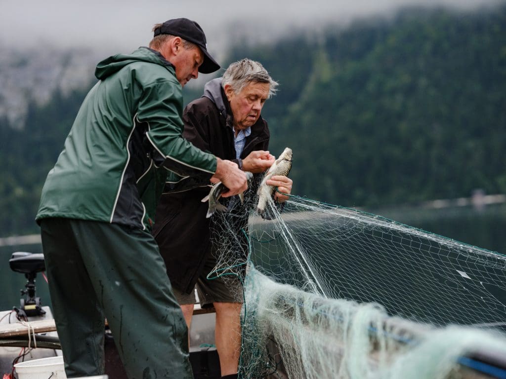 Die Netze stehen in der Nacht im See, in der Früh fährt man um sechs Uhr auf den See. Natürlich muss Rudolf Kalß auch über die berühmte Altausseer Lechpartie befragt werden, eine Institution des Feuers, der Gesänge und des Alkohols: In der Hütte wurden die Netze getrocknet, oft kamen vom Dorf Leute hinaus, brachten eine kleine Jause mit. Es wurde eine Institution. „Heute machen wir das eigentlich nicht mehr“, sagt Kalß. „Wir Fischer werden immer weniger, es ist eigentlich eine Sache von Pensionisten“, sagt Kalß, der früher bei der Gemeinde arbeitete. Ein Unterschied muss sein: „Die Altausseer Saiblinge sind sieben Jahre alt, das macht den Unterschied zum Aquakultur-Saibling aus“, sagt Kalß. Nicht der einzige Unterschied, muss sagen, wer beides – Aquakultur und Wildfang-Seesaibling – probiert hat. Keine gute Nachricht gibt’s zum Ende des Gesprächs mit dem Altausseer Saiblingsfischer: „Der Saibling ist ein Kaltwasserfisch. Wie lange es den hier noch geben wird, man weiß es nicht.“