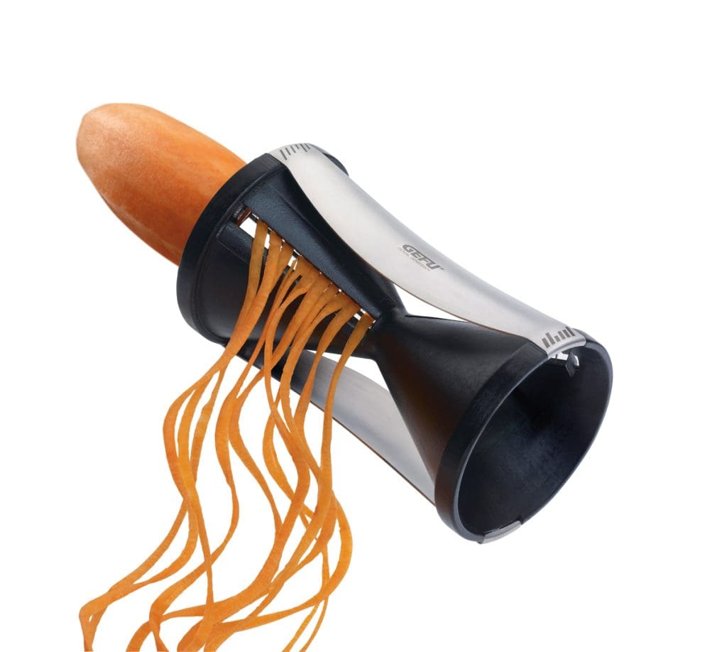 Auch wenn er kein Must in der Küche ist: Der Küchenhelfer kommt bei allen Testern gleichermaßen gut an. Das Prinzip des deutschen Fabrikats ist simpel und auf Anhieb verständlich: ­Spirelli funktioniert wie ein Bleistiftspitzer und verwandelt rohes Gemüse wie Karotten oder Zuccchini mittels weniger manueller Drehungen in fein geschnittene Julienne-Streifen. Gewählt werden kann zwischen zwei Feinheitsgraden. Plus: Das Werkzeug liegt gut in der Hand und lässt sich ohne Mühe bedienen.