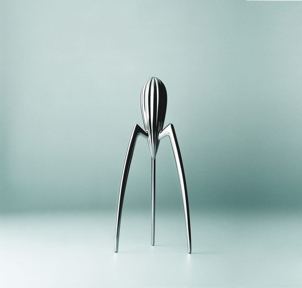Eine Krake dürfte Designer Philippe Strack bei der Produktentwicklung im Jahr 1990 inspiriert haben (als er vor den Entwürfen saß, soll er einen Oktopus gegessen haben). Für manche noch immer ein schönes Dekostück, für andere veraltetes Design. In Sachen Nützlichkeit werden keine Bestnoten vergeben: Nicht nur Fruchtsaft, sondern auch Kerne flutschen ins Glas, das man direkt unter die Konstruktion zu stellen hat. Als problematisch stellt sich die Handhabung auch in Bezug auf die Stabilität der Presse heraus: Die Füße von Juicy Salif machen sich während des Pressvorgangs selbstständig. Um das zu verhindern, muss man die Standbeine festhalten, während man die Zitrusfrucht presst. Plus: Der Fluss des Saftes ist un­gebremst und erfolgt in Form eines gleichmäßigen, dünnen Strahls. Minus: Da das Material aus Gussaluminium besteht, richtet der Hersteller in der Gebrauchsanweisung aus, dass es aufgrund „atmosphärischer Faktoren“ angegriffen werden kann. Um einen „schlechten Beigeschmack“ zu vermeiden, wird bei längerem Nichtgebrauch empfohlen, „den ersten ­gepressten Saft nicht zu verwenden“.