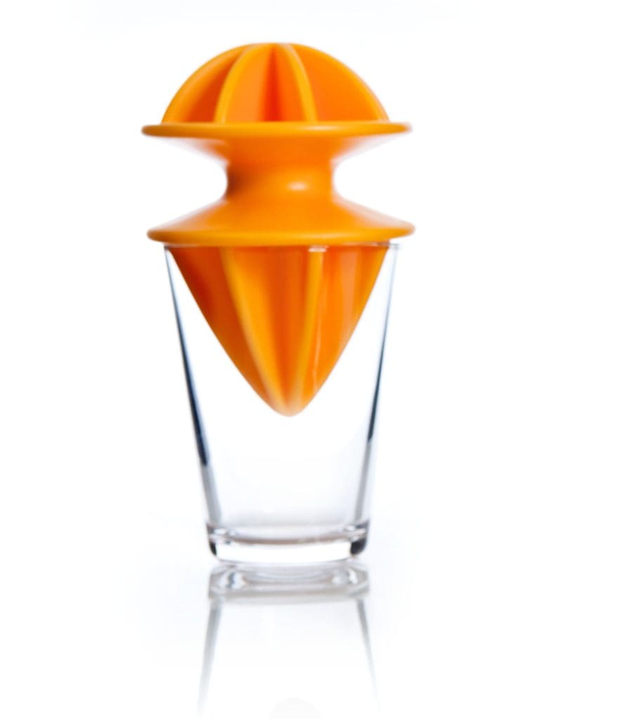 Beidseitig verwendbare Zitruspresse, die vom belgischen Designer Quentin de Coster für VKB Royal entwickelt wurde. Das Utensil besteht aus widerstandsfähigem Polypropylen und lässt sich direkt aufs Glas setzen. Die Böden beider Kegel sind mit Öffnungen ausgestattet, durch die der Saft von Orange, Zitrone und Grapefruit direkt in das Glas rinnen kann. Die Theorie verspricht einen smarten Küchenhelfer, in der Praxis versagt er allerdings. Die Handpresse sitzt nicht stabil am Glas, der Pressvorgang wird zur wackeligen und gefährlichen Angelegenheit: Schon bei normalem Druckaufwand springt ein Glas. Plus: Kerne werden durch die engen Öffnungen daran gehindert, im Trinkgefäß zu landen. Minus: Ebenfalls aufgefangen wird das Fruchtfleisch, es verstopft die Öffnungen und verursacht damit einen Stau. Orangensaft spritzt beim Pressvorgang, um das Glas entsteht eine pickige Lacke.