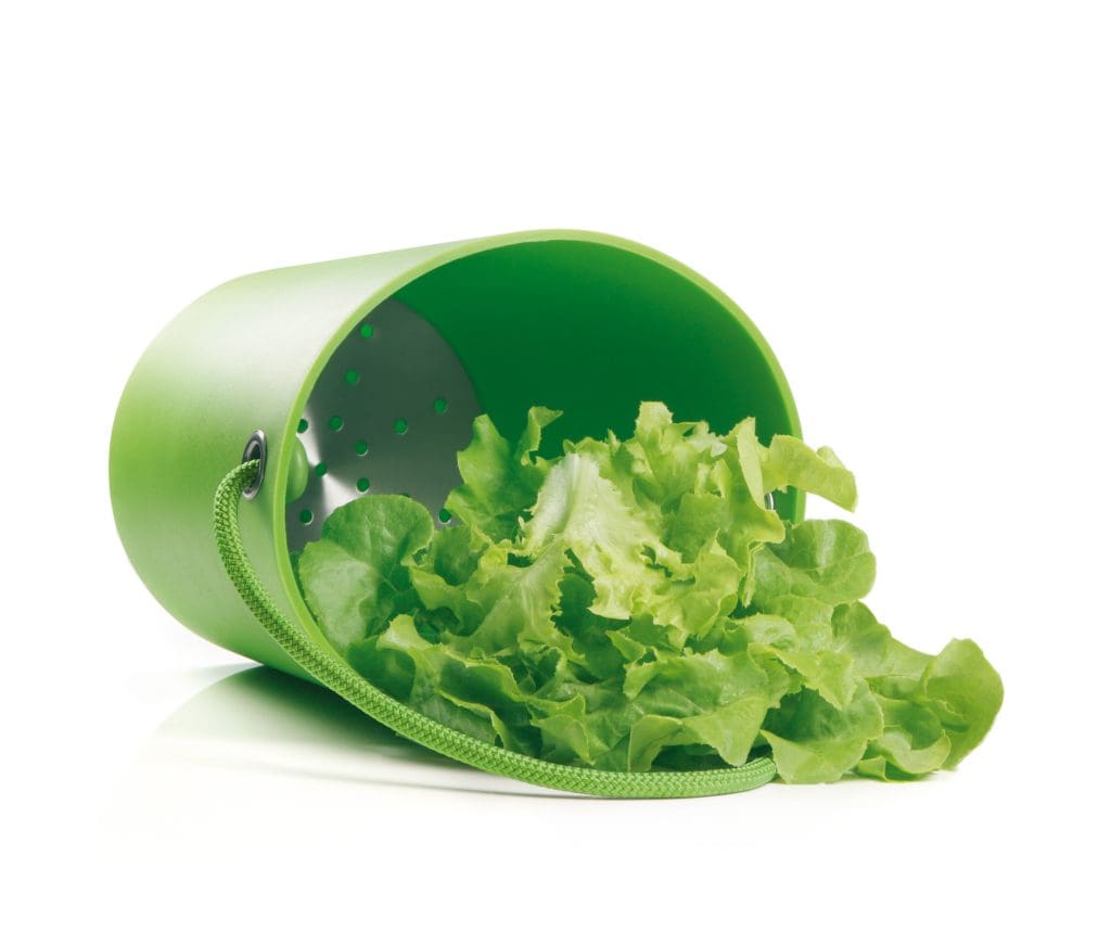 Die Idee vom dänischen Hersteller gefällt. Ein Kübel mit doppeltem Boden, in dem Salat einmal ganz anders geschleudert wird. Dazu muss man den Kübel mit Wasser befüllen, das Blattwerk hineinlegen und mit den Händen spülen. Im nächsten Schritt drückt man den oberen Rand der Schleuder zusammen, gießt das Wasser ab und beginnt zu schleudern: Dazu nimmt man den Henkel des Kübels und wirbelt das Utensil durch die Luft, wodurch sich überschüssiges Wasser und Schmutzpartikel in der integrierten Bodenplatte sammeln, in die Löcher gestanzt sind. Plus: Auf diese Art zu schleudern macht durchaus Spaß. Überraschend: Der Küchenboden ist trotz schwungvoller Bewegungen nicht mit Wassertropfen übersät. Minus: Schmutzpartikel finden sich auch nach mehreren Durchgängen im Salat.