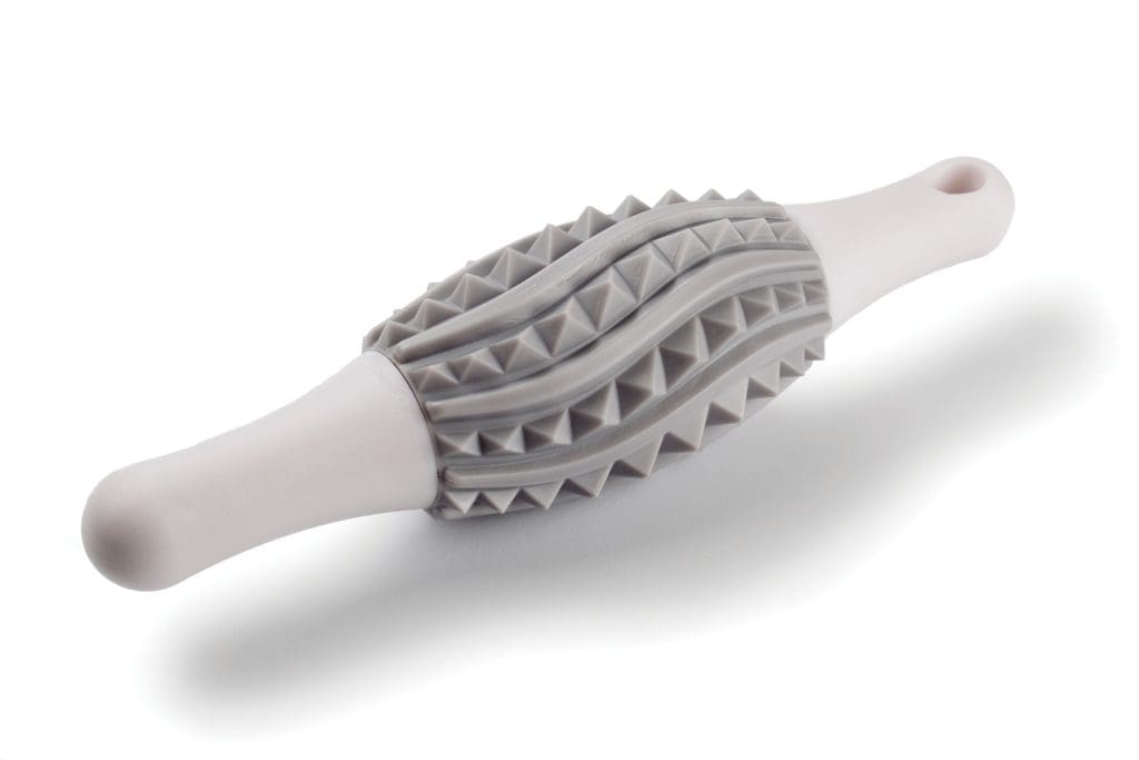 Die erste Assoziation: Ein Mininudelwalker, der anstatt mit einer glatten mit einer gezackten Oberflächenstruktur ausgestattet ist. Der Küchenhelfer mit dem Namen Tenderpress soll sich laut dem amerikanischen Hersteller (Fusionbrands hat sich auf ungewöhnliches Küchenwerkzeug spezialisiert) dazu eignen, Mürbteig mit Löchern zu versehen und Fleisch schonend zu plattieren. Der Versuch, Kalbfleisch in die ­gewünschte Schnitzelstärke zu transformieren, misslingt. Das Utensil verlangt dem Nutzer einen hohen Kraftaufwand ab, der Effekt ist dennoch gleich Null. Man rutscht mit den Händen an den kurzen Griffen ab und verletzt sich in Folge an den spitzen Zacken.