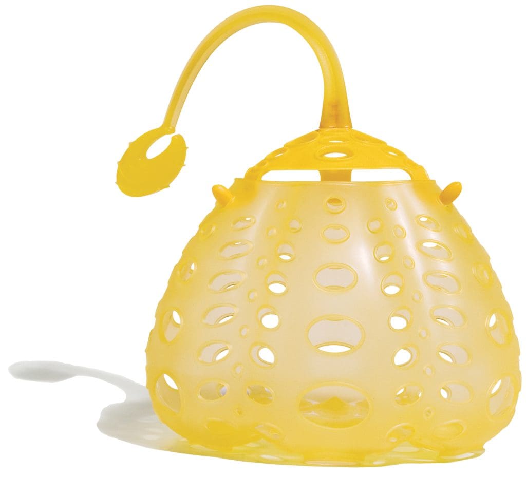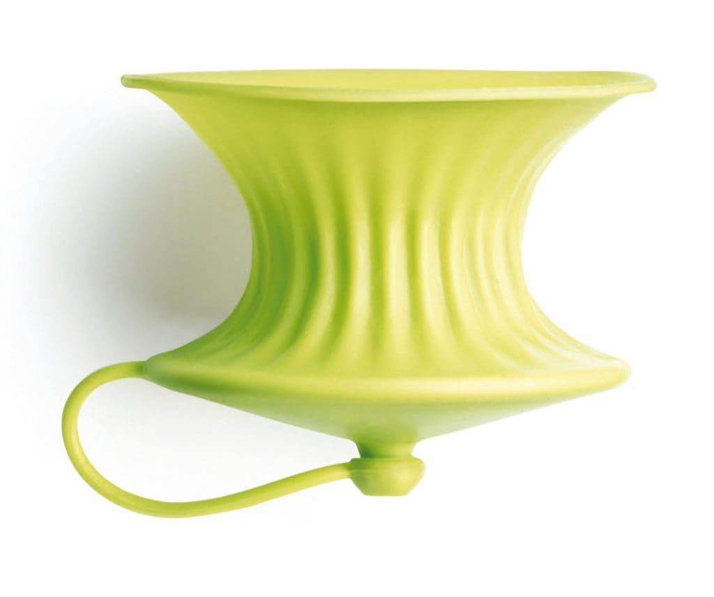 Kompakt, leicht zu reinigen und auf den ersten Blick hilfreich. Bei der Entwicklung des grünen Presskegels aus flexiblem Silikongehäuse hat der Erfinder vermutlich an ein Zitronennetz gedacht. Eine halbierte Zitrone wird mit der Schnittfläche nach unten in den Kegel gedrückt, auf dessen Boden sich ein kleines Loch befindet, durch die der handgepresste Saft (ohne Kerne) austreten kann. Auf der Außenseite läuft das Loch zu einer Tülle zusammen, die verschließbar ist und ermöglichen soll, dass man die Zitrone inklusive schützender Hülle nach Gebrauch noch einige Zeit im Kühlschrank aufbewahren kann. In Verwendung ­passiert das, was das Gehäuse eigentlich ver­hindern sollte: Überall rinnt es, überall pickt es, ­überall ist es nass.