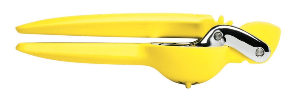 Eine Zitruspresse, die nach dem Prinzip einer Knoblauchpresse funktioniert und deren Spezialgebiet das Entsaften von Zitronen und Mandarinen ist. (In der „Werkzeugkollektion Fresh Force“ des Herstellers Chef’n befinden sich auch Modelle, die in ihrer Ausführung auf Orangen- und Limettengrößen abgestimmt sind.) Der Gebrauch gestaltet sich einfach: Eine Zitrushälfte wird mit der Schnittfläche nach unten in die Mulde der Presse gelegt, die in der Mitte mit einigen schmalen Öffnungen versehen ist, durch die der Saft im Optimalfall rinnt. Durch Einsatz des Hebels wird das Fruchtfleisch gequetscht; der Saft läuft durch die Schlitze, die verhindern, dass sich zu der Flüssigkeit im Glas auch störende Kerne gesellen. Minus: Der Küchenhelfer ist leicht zu bedienen, hat aber zu viel Gewicht. Plus: Wenig Kraftaufwand bei maximalem Output.