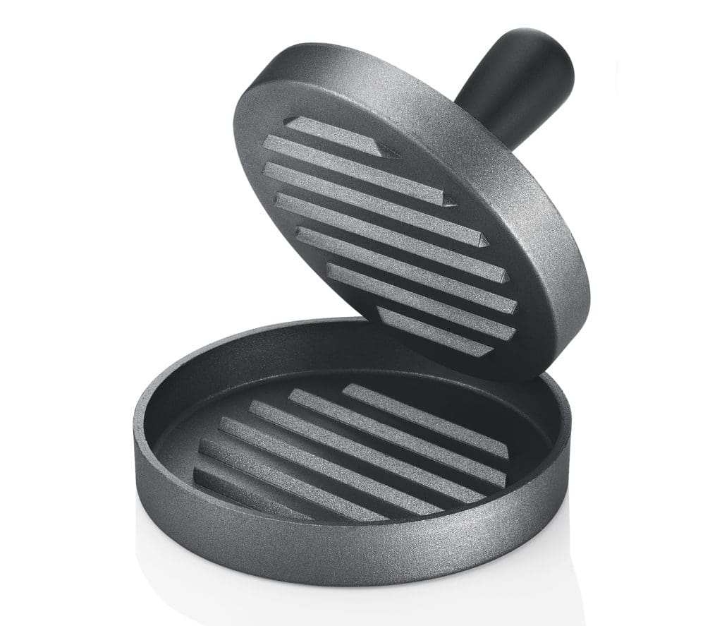 Braucht man so etwas? Eine Presse, die einheitlich große Laibchen formt und sie mit Rillen versieht? Fakt ist: Das Prinzip funktioniert. Die zweiteilige Presse ist mit Aluminium beschichtet, besteht aus einer Form und einer Art Stempel. Trotz anfänglicher Skepsis, ob das gepresste Faschierte auch wieder aus der Form fällt, gelingt es nach einem zweiten Versuch, die Masse im Ganzen auf einen Teller zu bewegen, ohne dass sie dabei zerfällt. Plus: Aus dem gleichmäßig geformten Laibchen entsteht in der Pfanne ein einheitlich saftiger Burger (allerdings ohne Rillen, sie verschwinden beim Bratvorgang).