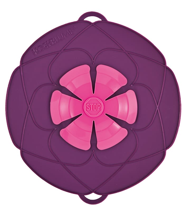 Ein buntes Teil, das auf alle Töpfe und Pfannen mit einem Durchmesser von 14 bis 24 cm und glattem Rand passt und Flüssigkeiten daran ­hindern soll, überzulaufen. Im Test wird der Schaum von kochendem Pastawasser gesammelt: Der äußere Teil liegt direkt am Topf auf, der innere öffnet sich beim Kochen und gibt die überlaufenden Mengen an das äußere Blatt ab, das Flüssigkeit und Schaum erfolgreich auffängt. Plus: Kochfeldputzen erübrigt sich. Minus: Bei der Zubereitung von Teigwaren ist es von Vorteil, die Bissfestigkeit während des Kochens zu prüfen. Der Hersteller rät allerdings davon ab, die Blume vor Beendigung der Anwendung ab­zunehmen, da Verbrühungsgefahr besteht.