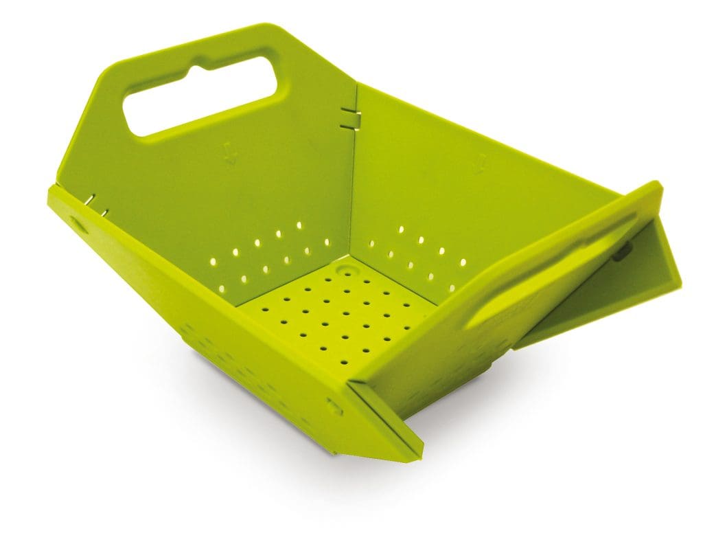 Das zweite faltbare Abseihsieb. Diesmal hat sich der britische Hersteller Joseph & Joseph mit der Thematik auseinandergesetzt und bei seinem Entwurf vermutlich an die Papierfaltkunst Origami gedacht. Der Küchenhelfer besteht aus robustem Polypropylen, ist in ungefaltetem Zustand zirka 42×33 Zentimeter groß, keine 5 Millimeter dick und passt am besten dorthin, wo auch Schneidbretter verstaut werden. Auch wenn es seinen Zweck erfüllt: In Verwendung ist das kantige, klobige Sieb, das auch in den Farben Weiß, Rot und Schwarz erhältlich ist, nicht besonders handlich und den Testern nur bedingt sympathisch. Minus: Das Sieb ist an den Seitenrändern nicht einmal bis zur halben Höhe mit Abtropflöchern versehen.