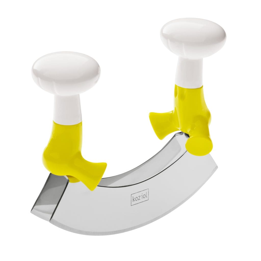Ein Wiegemesser, das mit zwei Klingen zu einem noch schnelleren und feineren Ergebnis führen soll. Bei richtiger Schnittführung gelingt das auch. Petersilie wird von dem leichten Küchenhelfer auffallend rasch in extrakleine Stücke zerlegt. Auch das Zerkleinern von Schokolade gelingt mit dem Zwilling aus Edelstahl nahezu ohne Anstrengung. Plus: Durch die Griffe ist die Verletzungsgefahr beim Schneidevorgang deutlich reduziert. Fraglich ist aber, wie man die Doppelklinge sicher verwahren kann.