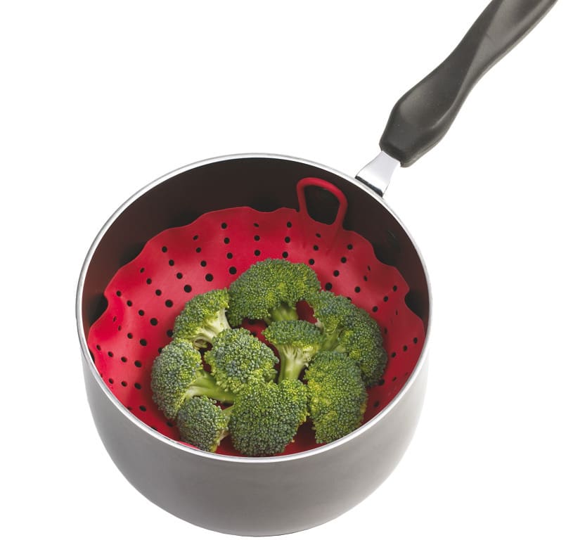 Ein flexibler Dämpfeinsatz aus hitzebständigem Silikon, der sich zum Garen von Gemüse, Fisch und Co eignet. Die Siebschale ist mit drei stabilen Füßen ausgestattet, die für nötigen Abstand zwischen Wasser und Gargut sorgen; zwei Griffe sollen eine sichere Entnahme aus Töpfen jeglicher Größe gewährleisten. Der Praxistest zeigt, dass kaum Wasser eingefüllt werden darf, da der Dampfeinsatz inklusive Gargut sonst darin schwimmt. Ausschließlich Lebensmittel mit geringer Garzeit können gegart werden, da das Wasser verdampft, bevor Gemüse und Co fertig sind. ­Minus: Die Griffe machen nur vor der Verwendung Sinn, danach kann Sleekstor erst entnommen ­werden, wenn der Topf nicht mehr heiß ist.