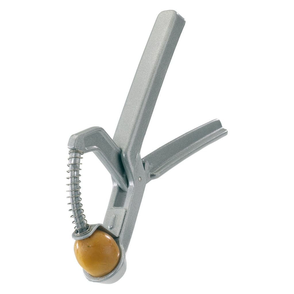 Auf den ersten Blick mehr Gimmick als nützliches Hilfsmittel. Die Tester assoziieren damit ein Teil (eine Zange?) aus dem Werkzeugkasten. Da Oliven besser schmecken, wenn der Hersteller sie mit Kern ins Glas füllt, man mit den Zähnen aber keine Chance auf den gesamten Fruchtanteil hat, macht das vorerst belächelte Utensil doch für jeden Sinn. Ist es einmal in Betrieb, weiß man, was man daran hat. Um eine Olive zu entkernen, legt man sie in die Mulde des Entsteiners aus Aluminium, drückt die Griffe des Werkzeugs zusammen und aktiviert damit den gebogenen Stößel, der den Kern sauber und ohne jegliche Mühe aus der Frucht löst. Plus: Das Küchentool eignet sich auch dazu, Kirschen zu entkernen. Minus: Der Entsteiner beginnt nach wenigen Anwendungen zu quietschen und könnte eine Ölung vertragen.