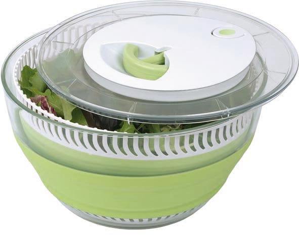 Auf den ersten Blick eine klassische Salatschleuder. Ihr Trumpf: Der Preisträger des Red Dot Design Awards ist mit 26 Zentimetern Durchmesser, 4,5 Liter Volumen und 15 Zentimetern Höhe nicht nur Schleuder, sondern auch Schüssel, schrumpft nach Gebrauch auf weniger als 8 Zentimeter und benötigt somit nur wenig Platz im Küchenkasten. Während seiner Verwendung ist das Utensil stabil und klappt nicht zusammen. Plus: Der Schleudervorgang (er wird klassisch mittels Schnur aktiviert), kann auf Wunsch per Tastendruck jederzeit gestoppt werden. Der Küchenhelfer wird im Geschirrspüler auch in gefaltetem Zustand sauber.