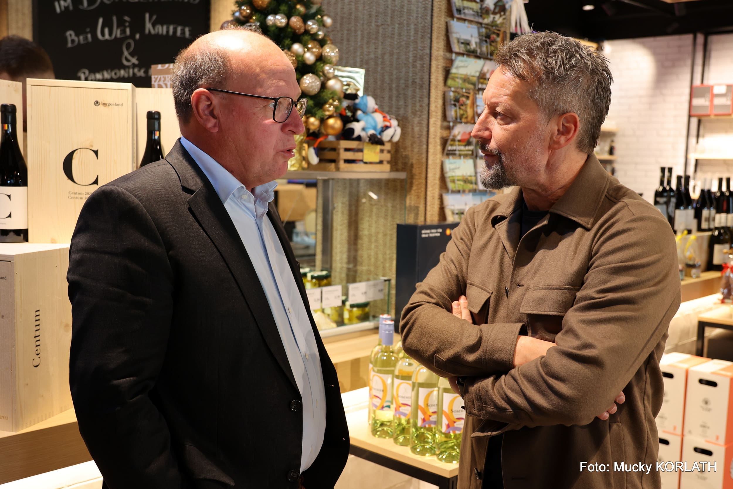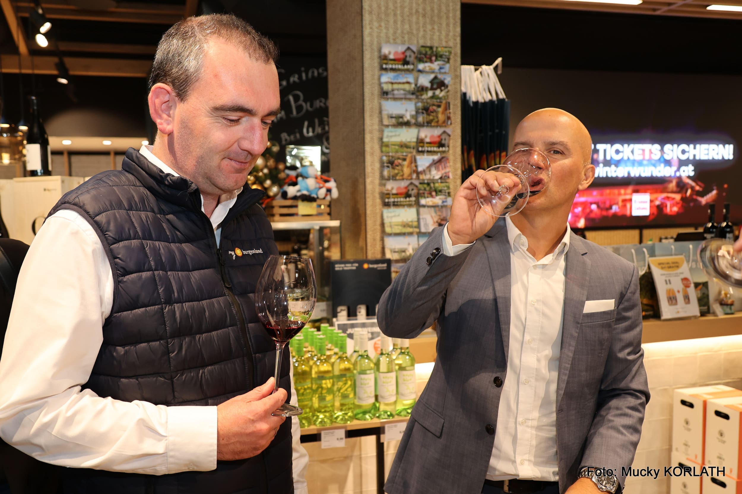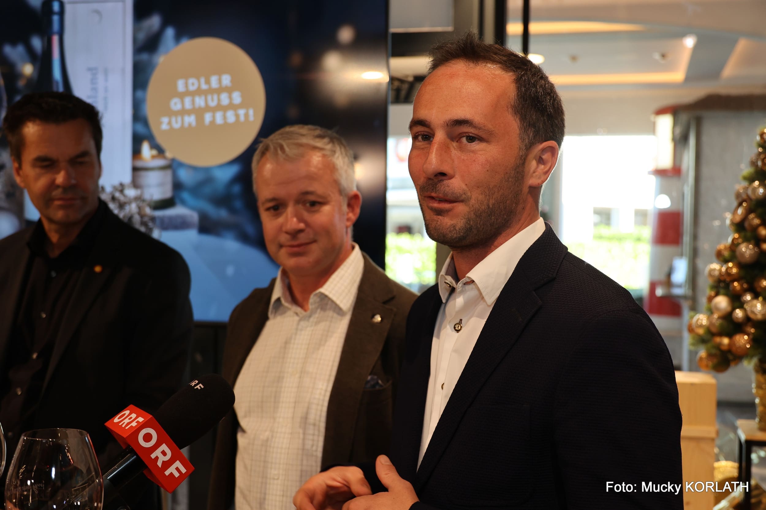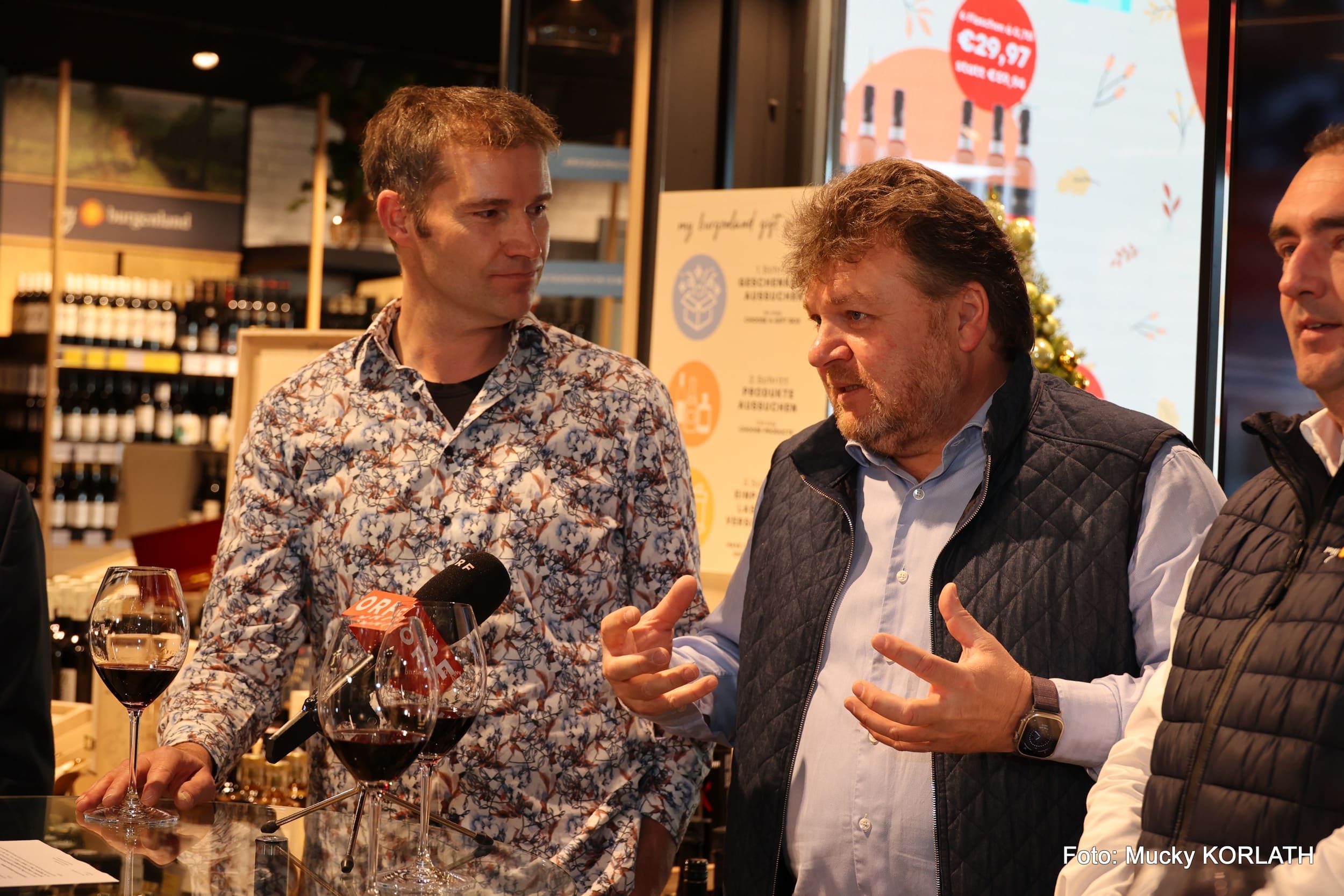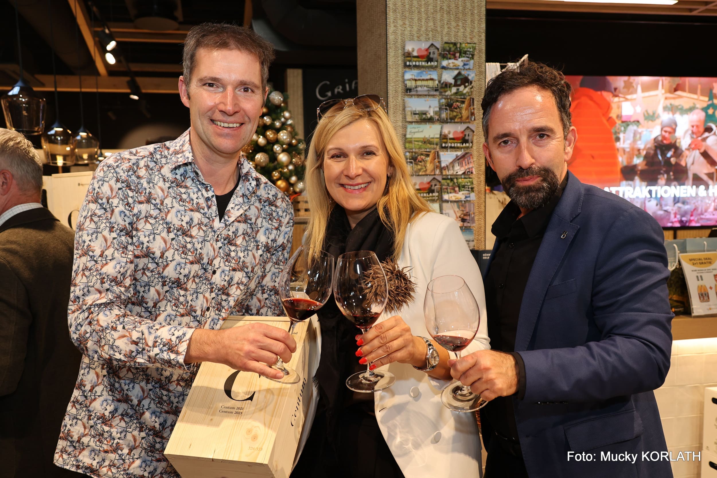 Exklusiv im „my burgenland“-Shop im Designer Outlet Parndorf wird eine Box mit je einer Flasche CENTUM 2021 und 2023 angeboten – streng limitiert auf 333 Stück. Jede Box ist ein Stück burgenländischer Geschichte zum Genießen. Ab 15. November gibt es den CENTUM 2023 auch einzeln, in einer edlen Holzkiste verpackt. Präsentiert wurde der erlesene Tropfen gemeinsam mit Wein-Burgenland-Geschäftsführer Christian Zechmeister und Vurgenland Tourismus-Geschäftsführer Didi Tunkel.