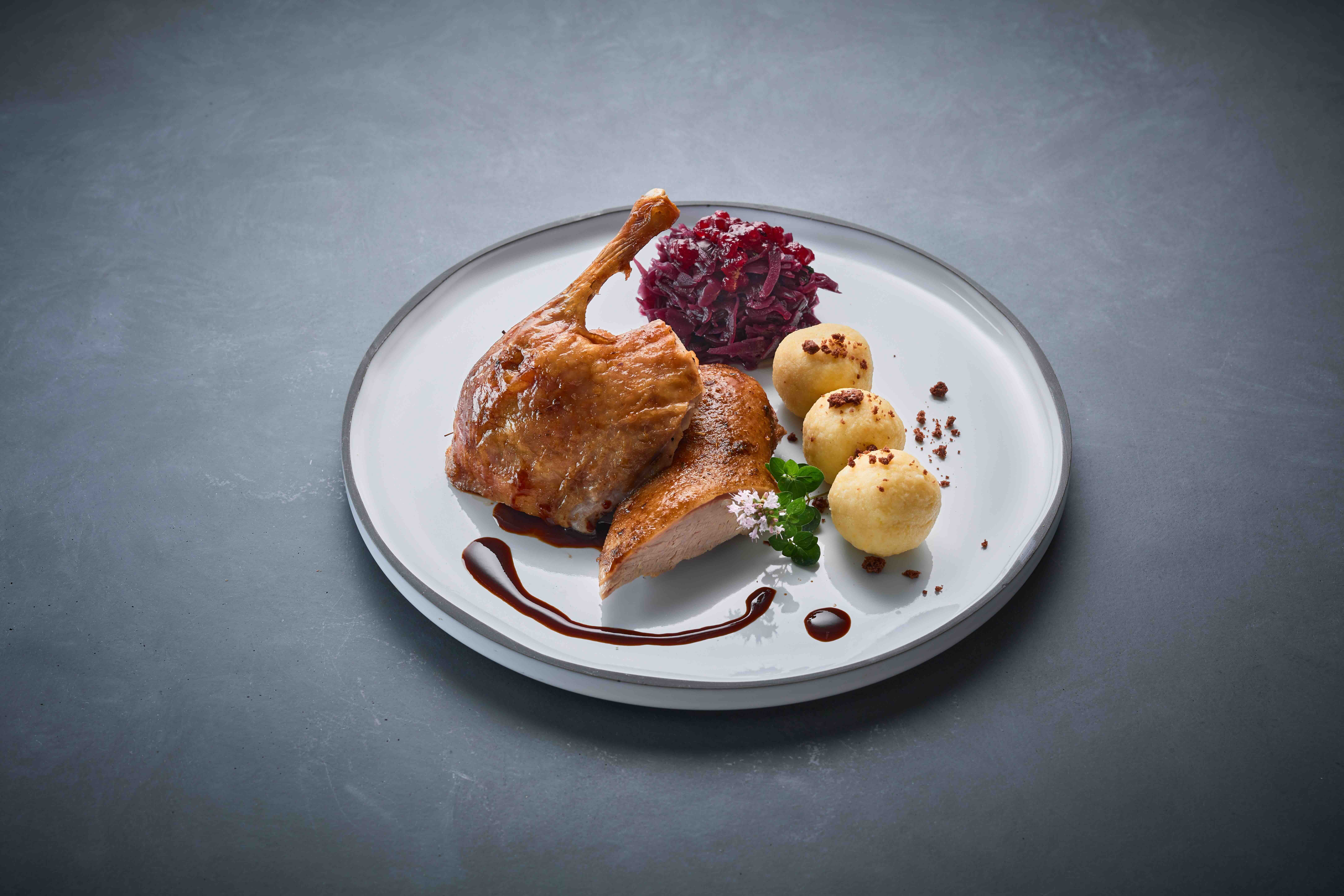 Im INTERSPAR à la carte Restaurant das Mezzanin am Schottentor landet am Dienstag, 11. November, die Gans in Bestform auf dem Teller. Zart und knusprig zugleich, dazu Rotkraut, Maroni, Kartoffelknödel und satter Bratensaft. Vorweg grüßt die Küche mit hausgemachten Aufstrichen und ofenwarmem Gebäck, dann folgen Gänseleberparfait auf Johannisbeer-Spiegel und eine klassische Gansleinmachsuppe mit Wirsing und Ganslklein. Zum Finale kommt Topfen Zimtmousse mit in Rum eingelegtem Powidl.