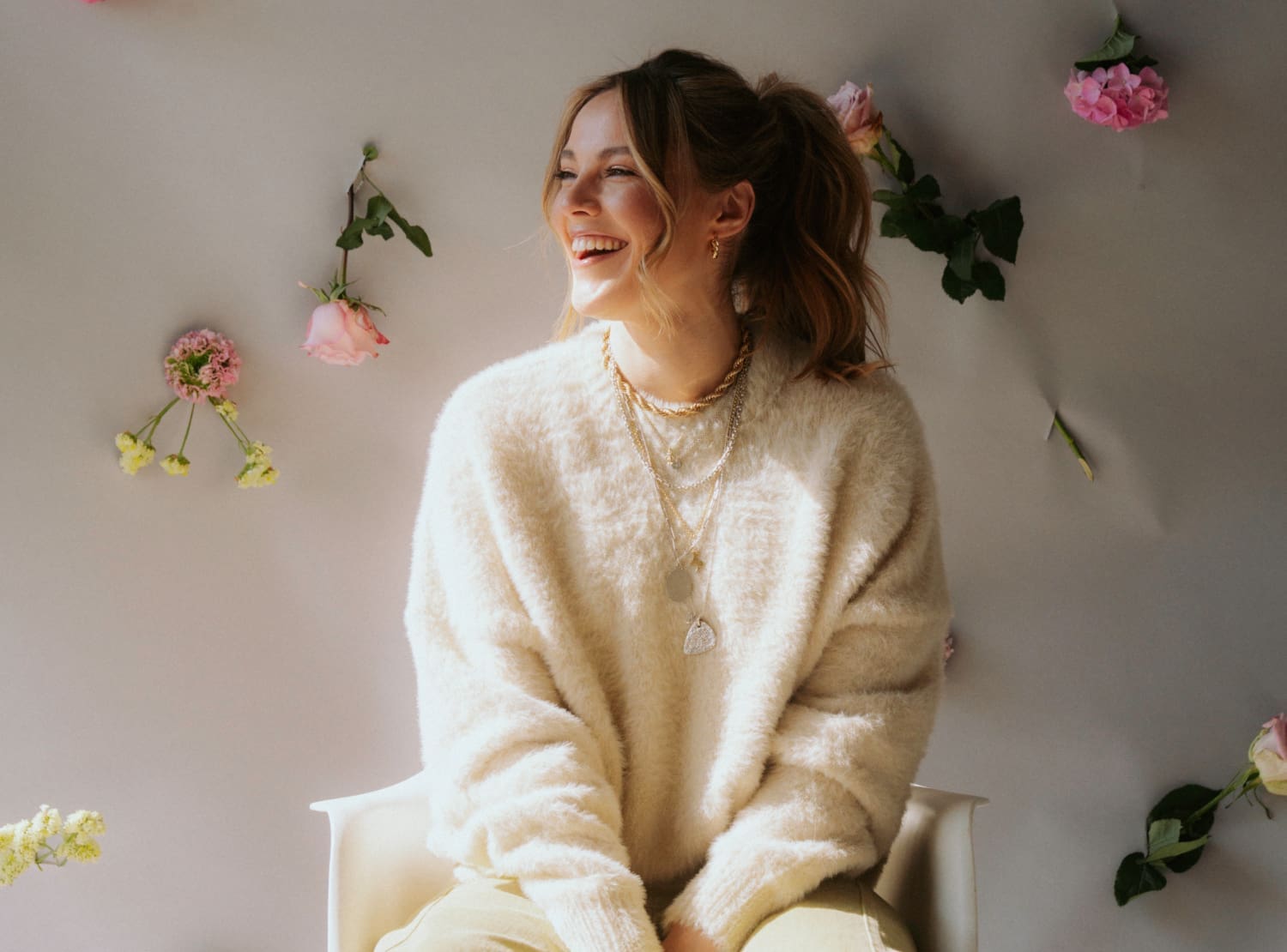 lachenden, blonde Person; fallende pinke Blumen
