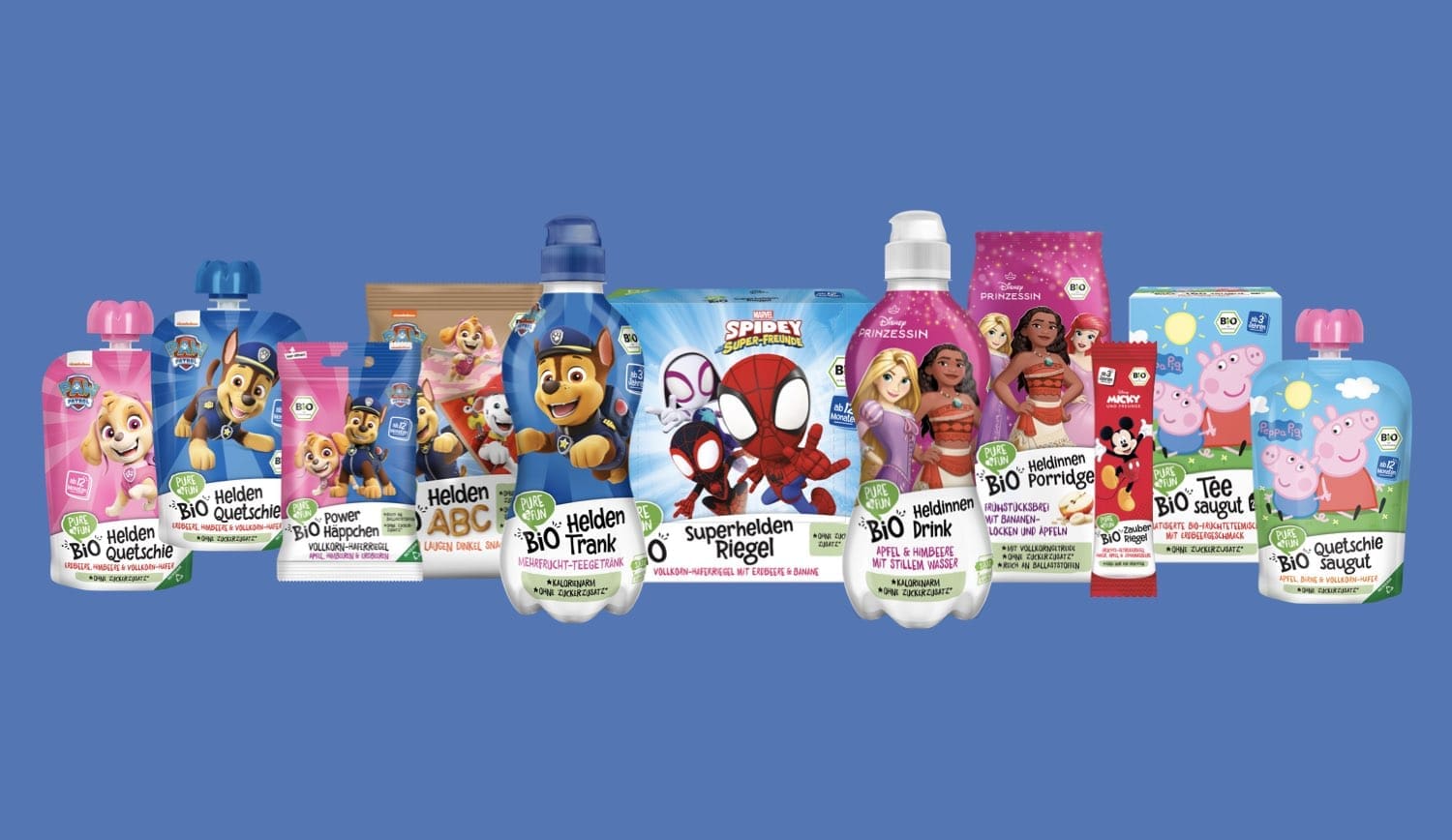 Mit viel Liebe entwickelt, begleiten sie kleine und große Entdecker durch den Alltag: ob beim Spielen im Park, auf dem Weg in den Kindergarten, als Pausenheld in der Schultasche oder bei den großen und kleinen Abenteuern. PURE&FUN verbindet echten Genuss mit spielerischem Spaß und entwickeln Bio Snacks und Getränke, die so natürlich sind, wie Kinder sie verdienen. Mit Zutaten aus kontrolliert biologischem Anbau, nur mit der natürlichen Süße aus Früchten und ohne künstliche Zusätze sind die Produkte kindgerecht und lecker! Trotz ihrer Natürlichkeit bringen sie eine leichte Süße mit, die genau den Geschmack von Kindern trifft. Auch die Verpackung kann sich sehen lassen: Dank exklusiven Partnerschaften mit den großen Filmstudios landen die Lieblingsheldinnen und -helden der Kinder direkt auf den Bio Snacks und Getränken. Mutige Fellfreunde, eine liebenswerte rosa Schweinefamilie, tapfere Superhelden, heldenhafte Prinzessinnen, eine kleine Zaubermaus, eine ziemlich coole Königin mit Schneemann oder eine fröhliche blau-orange Hundefamilie. Das Ergebnis? Kinder greifen freiwillig zu Snacks, die gut tun und Eltern können entspannt „Ja“ sagen.