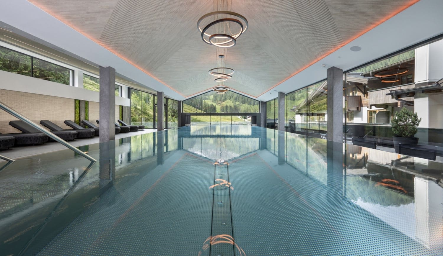 Ein herausragendes Merkmal der Neuerungen ist der großzügig gestaltete neue Poolbereich, der mit modernen Elementen und einem atemberaubenden Blick auf die umliegende Bergwelt begeistert. Der 25 Quadratmeter große Pool lädt nicht nur zum Schwimmen ein, sondern bietet auch einen Ort der Ruhe und Entspannung – ein ideales Ambiente nach einem aktiven Tag in der Natur. Die harmonische Verbindung von Komfort und Natur wird auch durch den renovierten Wellnessbereich unterstrichen, der mit verschiedenen Saunen und einem umfangreichen Angebot an Massagen und Behandlungen zum Verweilen einlädt.