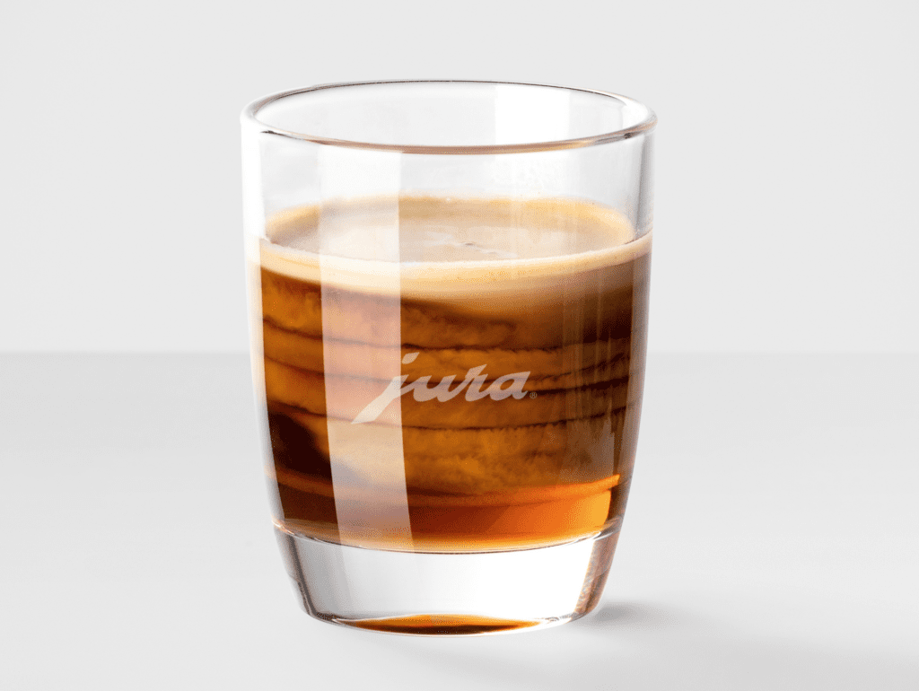- Bereiten Sie den Espresso direkt ins Espressoglas zu und füllen Sie es mit Kaffeesahne auf.