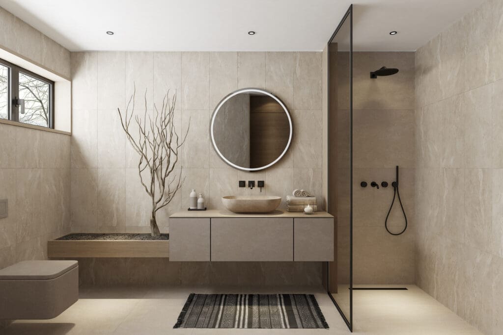 Im Mittelpunkt der Gestaltung steht Keramik. Sie gilt als Material der Stunde und zeigt sich vielseitiger denn je. Matte Oberflächen unterstreichen den Wunsch nach Zurückhaltung, während Marmor- und Steinoptiken Eleganz ins Bad bringen, ohne dominant zu wirken. Besonders gefragt sind großformatige Fliesen mit möglichst wenig Fuge, die dem Raum Weite verleihen und für ein ruhiges Gesamtbild sorgen. Ergänzt werden sie durch 3D-Fliesen, Rillen-Optiken und texturierte Waschbecken, die Haptik und visuelle Tiefe ins Spiel bringen.