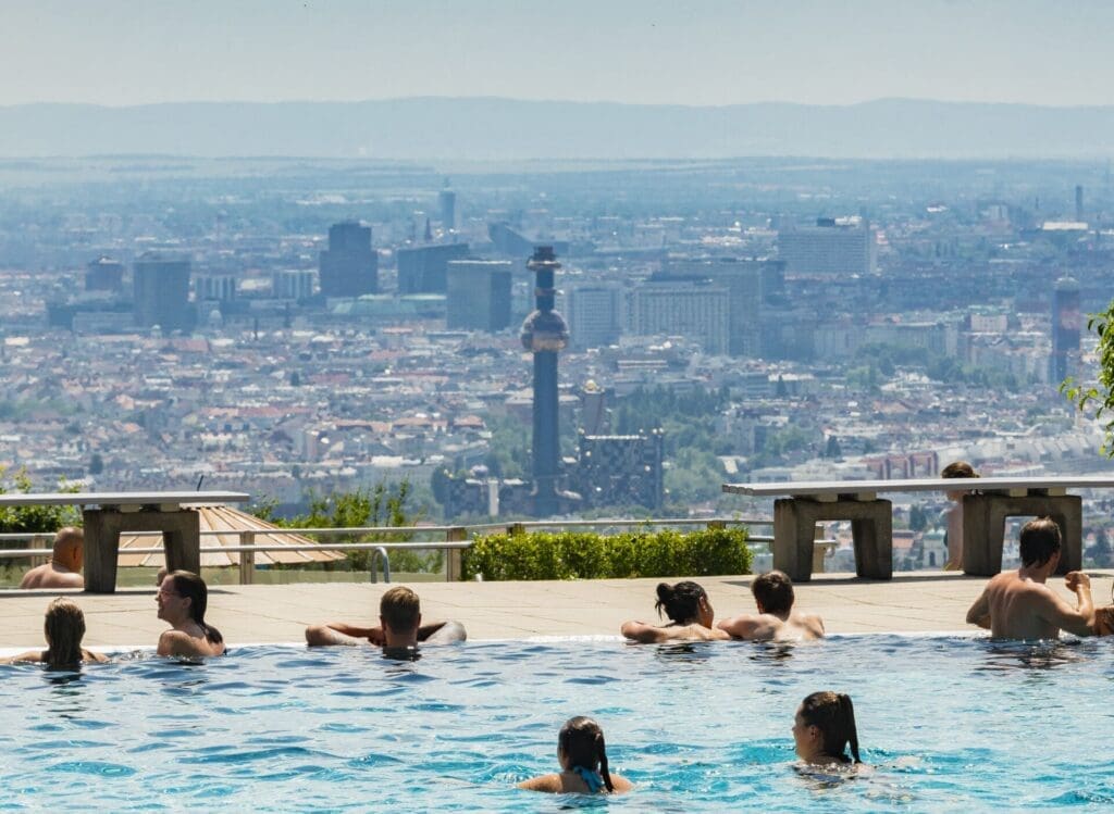 To, čo robí Krapfenwaldlbad takým výnimočným, nie je len chladivá voda, ale predovšetkým jeho poloha. Kto sa tu kúpe, pláva s úžasným výhľadom. Z ležadiel sa otvára veľkolepá panoráma viedenských striech, ktorá za jasného počasia a dobrej viditeľnosti siaha až po pohorie Leithagebirge. Najmä neskoro popoludní, keď je slnko nízko a nad Dunajom leží zlatisté svetlo, je výhľad jednoducho čarovný.