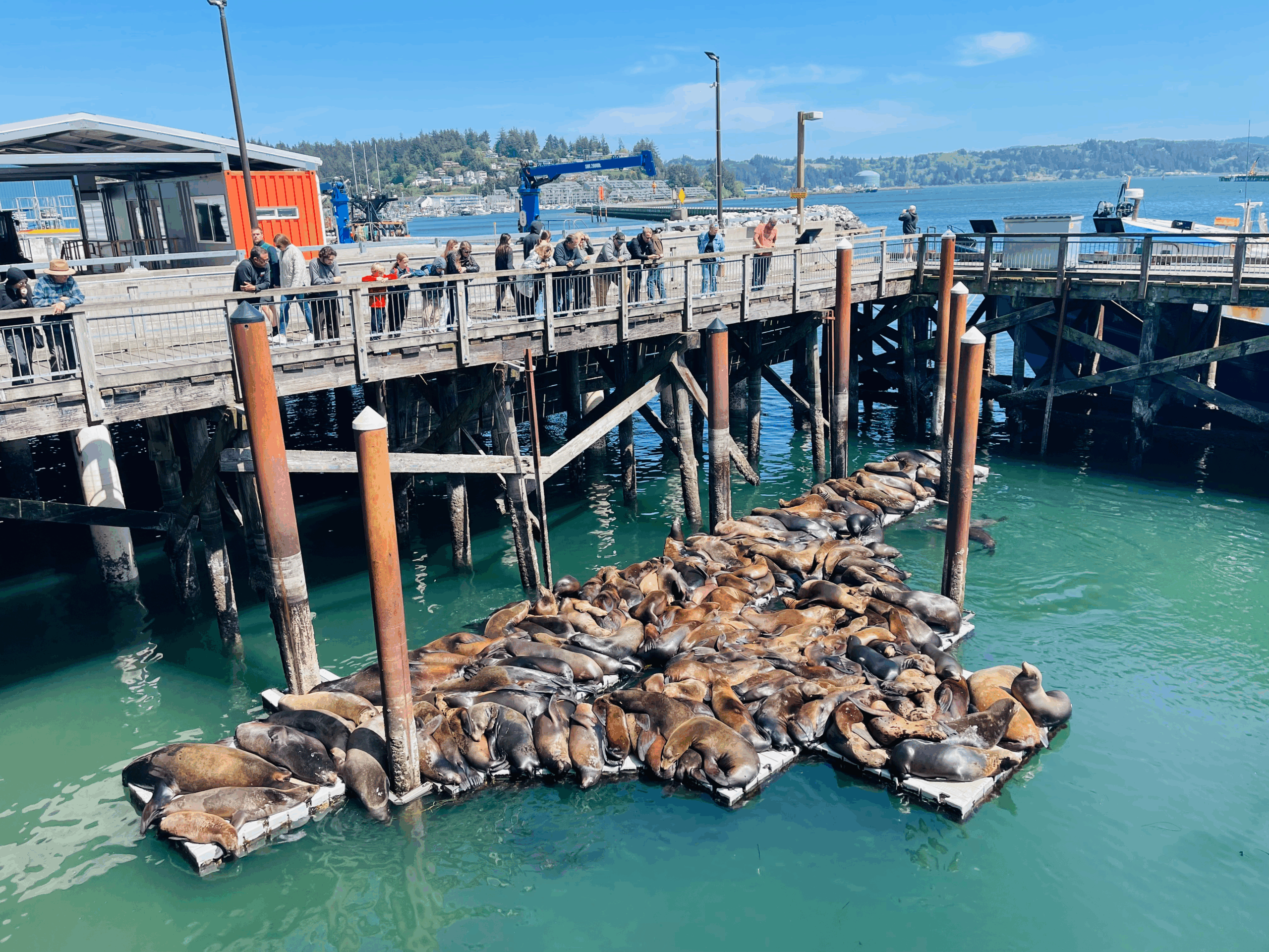 Nach einer herzlichen Verabschiedung zurück im Jeep, geht es weiter nach Norden entlang der insgesamt 584 Kilometer langen Küste. Sie zählt zwar noch zu den Geheimtipps der USA, wird aber angesichts ihrer Vielfalt immer beliebter. Hier regieren Ruhe und Naturbelassenheit, wechseln sich steile Klippen mit Traumstränden ab, zieren Leuchttürme wie Juwelen ein Diadem und laden Wälder direkt an der Küste zu grünen Abstechern ein. Hätte man doch nur mehr Zeit, aber auch so erfreut mich der eine oder andere lohnende Stopp. Nördlich von Florence sind es zum Beispiel direkt am Highway 101 die Sea Lion Caves. Es handelt sich hier mit einer Höhe von fast 40 Metern um Amerikas größte Meereshöhle, in der das ganze Jahr über bis zu 200 Seelöwen ein Zuhause gefunden haben. Und runter in die Höhle geht es mit einem Lift, sehr bequem! Das wird dann im Hafenstädtchen Newport getoppt. Bei einem Bummel an der Historic Bayfront hört man eine Hundertschaft an Seelöwen, die sich am Pier breitmachen. Einfach an die Reling lehnen, dem tierischen Treiben zuschauen und sich dem strengen Geruch hingeben.